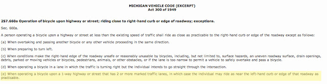 We rode off, and I can't say that we weren't a little frustrated at the power trip that we had just been a part of. Well, the ride was awesome, and Donnie did great for his first big ride. He's actually a pretty strong rider. When we got home, Donnie hopped on the computer to do a little research and came up with this interesting Michigan Bike Law: